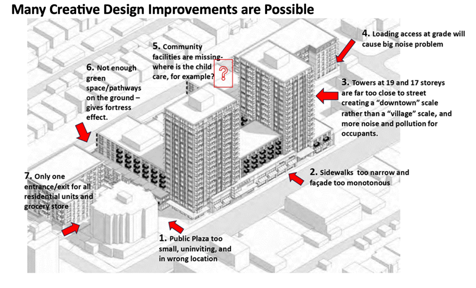 Our community efforts for a better development—now spanning three years—have largely been ignored by BGO and the City. Yes, the grocery store will be replaced, and we will get 571 units of rental housing, with 20% of the units having a subsidy, and that means more customers for our village shops. But we will not get any community facilities such as a childcare centre or a purpose-built library which further strains our childcare crisis and our undersized library occupying a former bank branch.