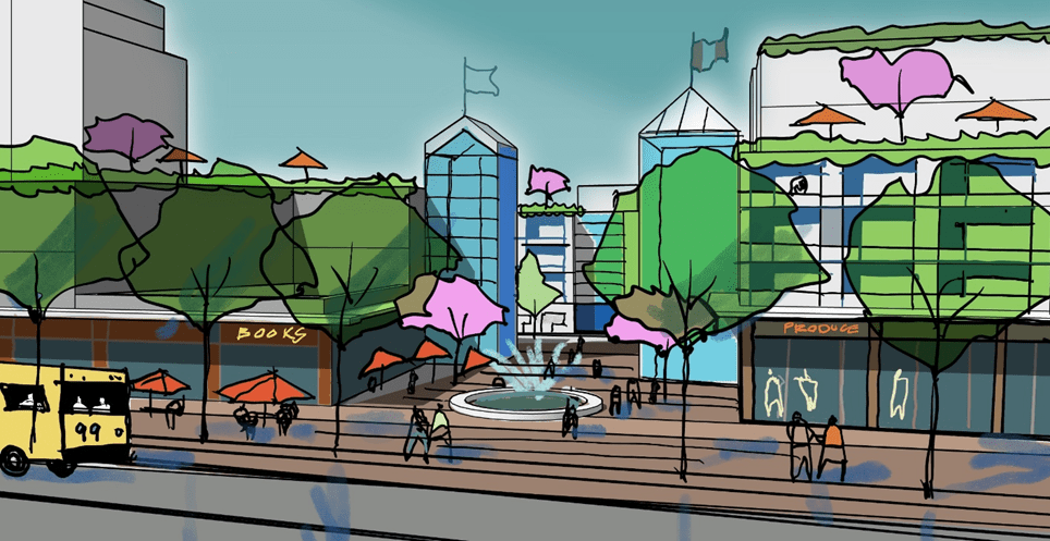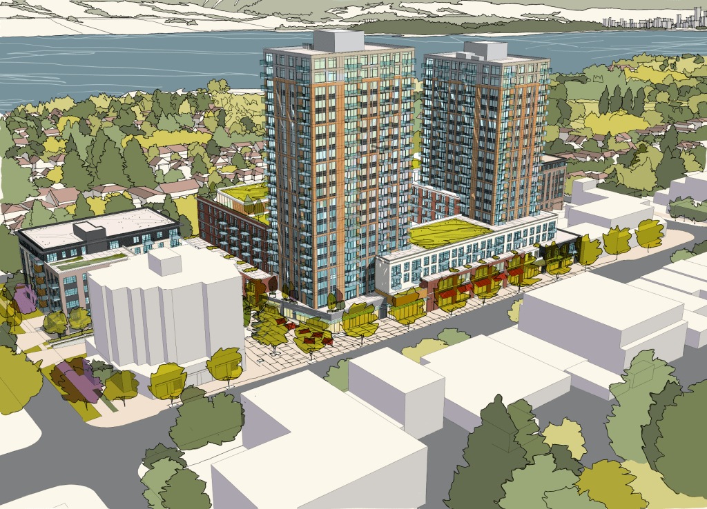 Artist concept of what a village-friendly development could look like with plenty of new market rental and below market rental housing and a grocery store plus creating a heart for the village with a central plaza and community facilities such as a child care.